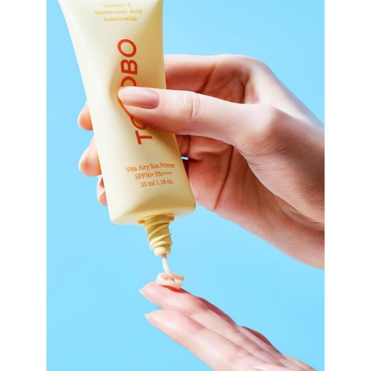 الوصف : Vita Airy Sun Primer SPF50+ PA++++ is a multifunctional sunscreen that also works as a makeup primer. It combines broad-spectrum UV protection with a lightweight, airy balm texture that helps to blur pores, control sebum, and create a smooth base for makeup. The formula often includes soothing and barrier-supporting ingredients such as Madecassic Acid, Asiaticoside (from Centella Asiatica), and Vitamin E, providing antioxidant benefits and a velvety matte finish without a heavy feel or white cast.